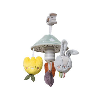 Cet accessoire de poussette vivant et interactif est spécialement conçu pour stimuler les bébés pendant qu'ils sont confortablement allongés dans leur poussette. Le mobile se compose de divers éléments ludiques, dont le petit lapin nommé Rylee, une carotte et des tulipes suspendues à un feuillage vert. Ces éléments colorés sont destinés à stimuler le développement des compétences de suivi visuel chez les bébés, tout en s'émerveillant et en regardant les objets en mouvement au-dessus d'eux.