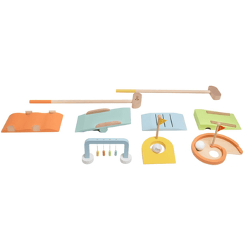 Ce set de mini-golf en bois est une source de plaisir pour nos tout-petits golfeurs ! Le set contient tout ce dont vous avez besoin : clubs de golf, gobelets de putting avec drapeaux, balles et cinq obstacles uniques.