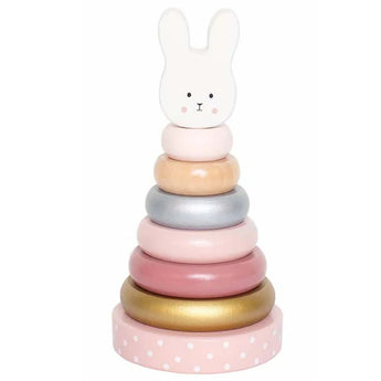 Cette tour d'empilage a différentes couleurs et est décorée en haut avec un petit lapin en bois.